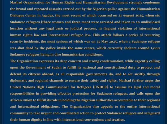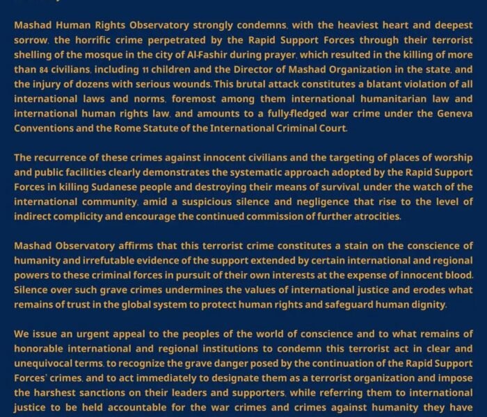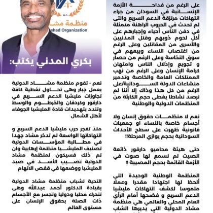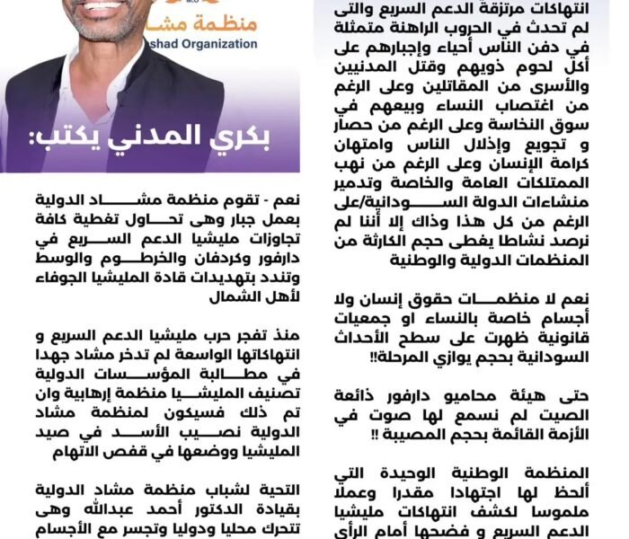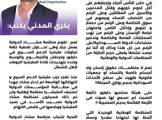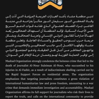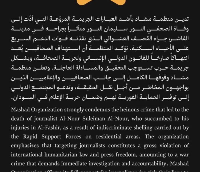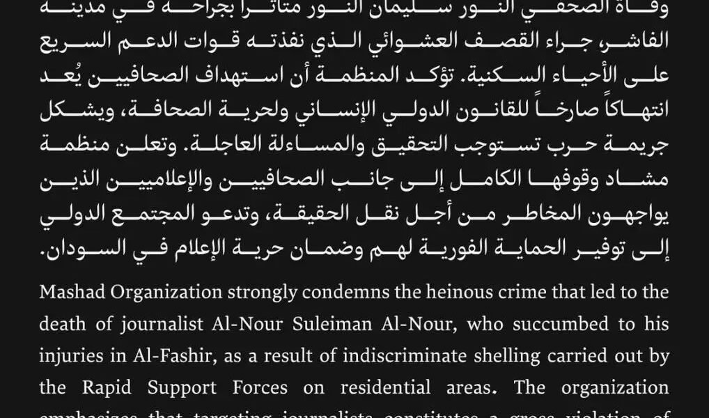تدين منظمة مشاد بأشد العبارات الجريمة المروّعة التي أدّت إلى وفاة الصحفي النور سليمان النور متأثراً بجراحه في مدينة الفاشر،.