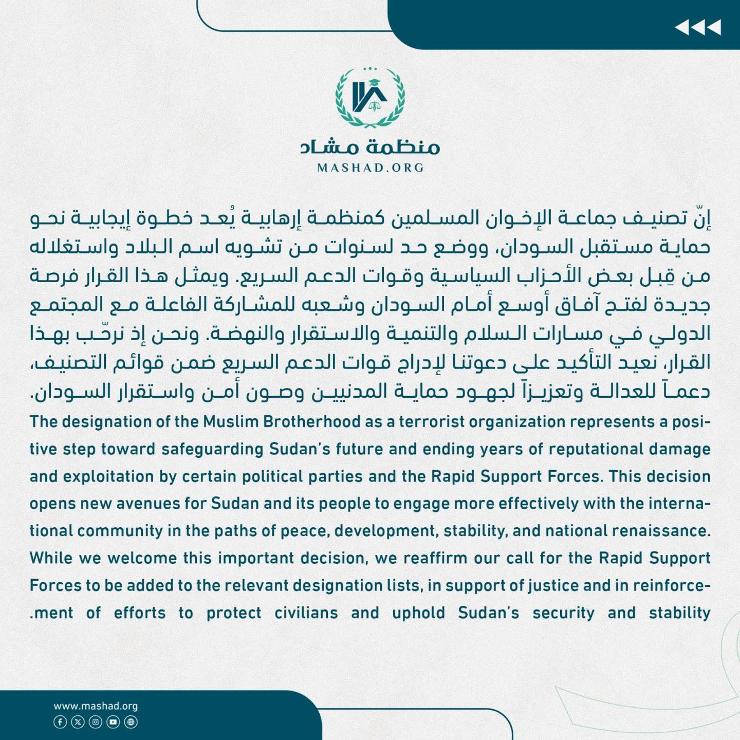 The designation of the Muslim Brotherhood as a terrorist organization represents a positive step toward safeguarding Sudan’s future and ending years of reputational damage and exploitation by certain political parties and the Rapid Support Forces. This decision opens new avenues for Sudan and its people to engage more effectively with the international community in the paths of peace, development, stability, and national renaissance.While we welcome this important decision, we reaffirm our call for the Rapid Support Forces to be added to the relevant designation lists, in support of justice and in reinforcement of efforts to protect civilians and uphold Sudan’s security and stability.