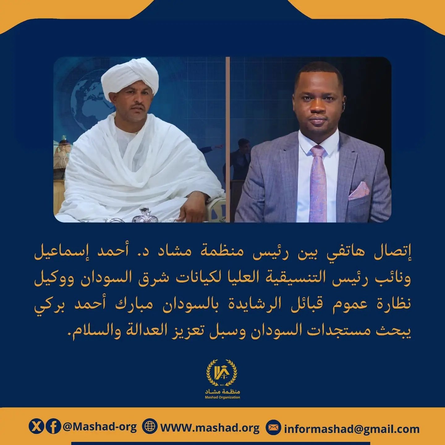 أجرى رئيس منظمة مشاد، معالي د. أحمد عبدالله إسماعيل اتصالاً هاتفياً مع نائب رئيس التنسيقية العليا لكيانات شرق السودان ووكيل ناظر عموم الرشايدة السيد مبارك أحمد حميد بركي.