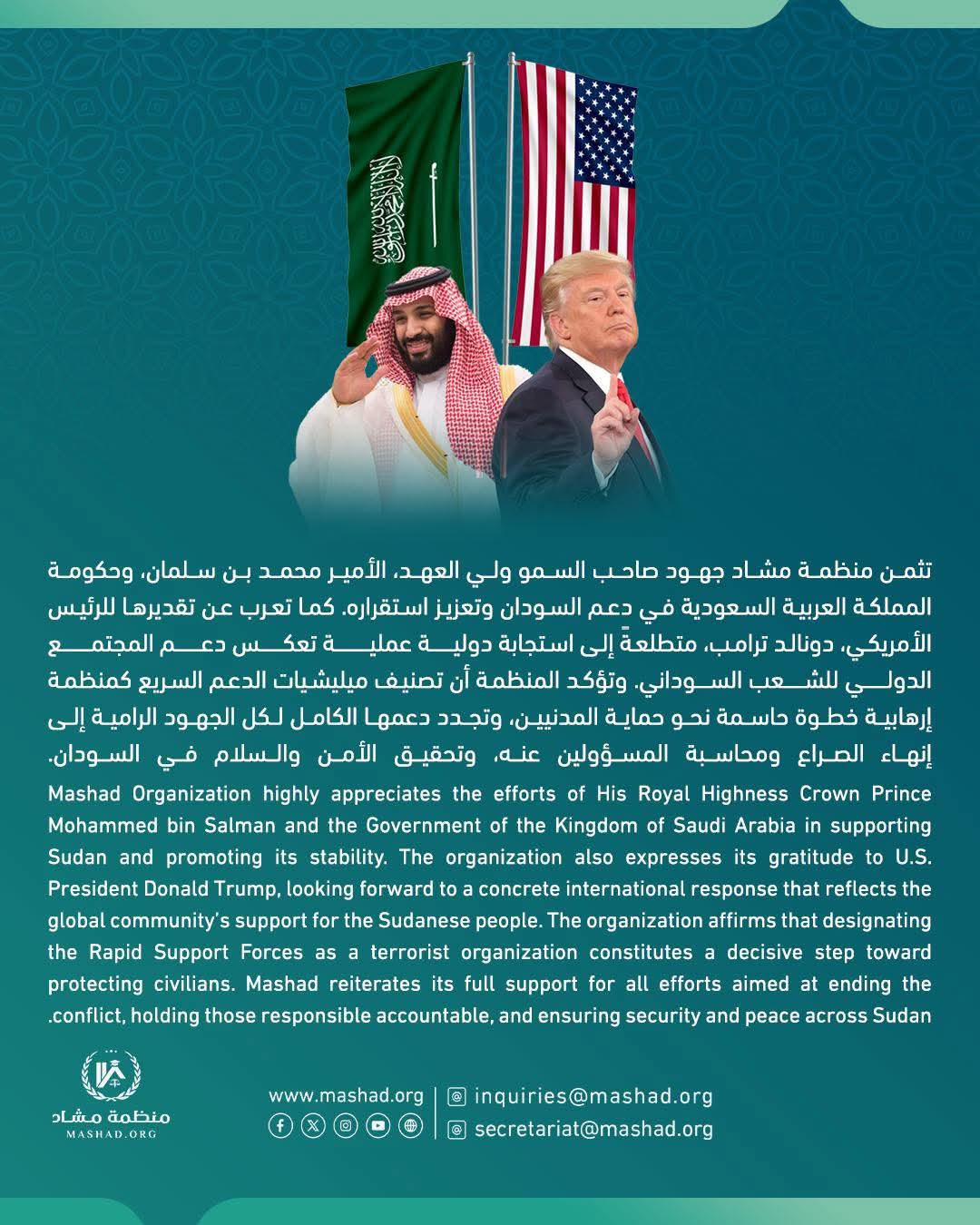 Mashad Organization highly appreciates the efforts of His Royal Highness Crown Prince Mohammed bin Salman and the Government of the Kingdom of Saudi Arabia in supporting Sudan and promoting its stability. The organization also expresses its gratitude to U.S. President Donald Trump, looking forward to a concrete international response that reflects the global community’s support for the Sudanese people.The organization affirms that designating the Rapid Support Forces as a terrorist organization constitutes a decisive step toward protecting civilians. Mashad reiterates its full support for all efforts aimed at ending the conflict, holding those responsible accountable, and ensuring security and peace across Sudan.