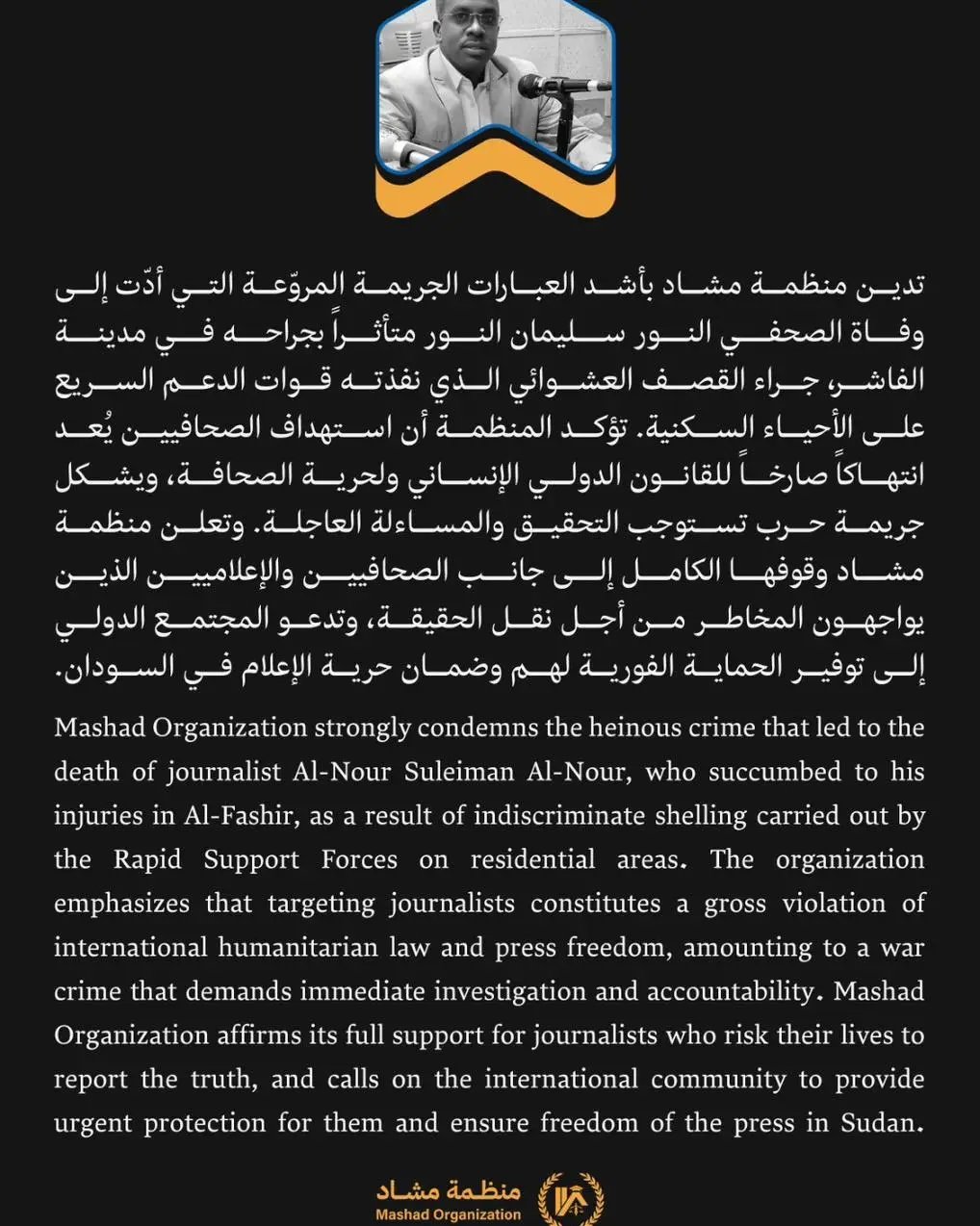 Mashad Organization strongly condemns the heinous crime that led to the death of journalist Al-Nour Suleiman Al-Nour, who succumbed to his injuries in Al-Fashir, as a result of indiscriminate shelling carried out by the Rapid Support Forces on residential areas.