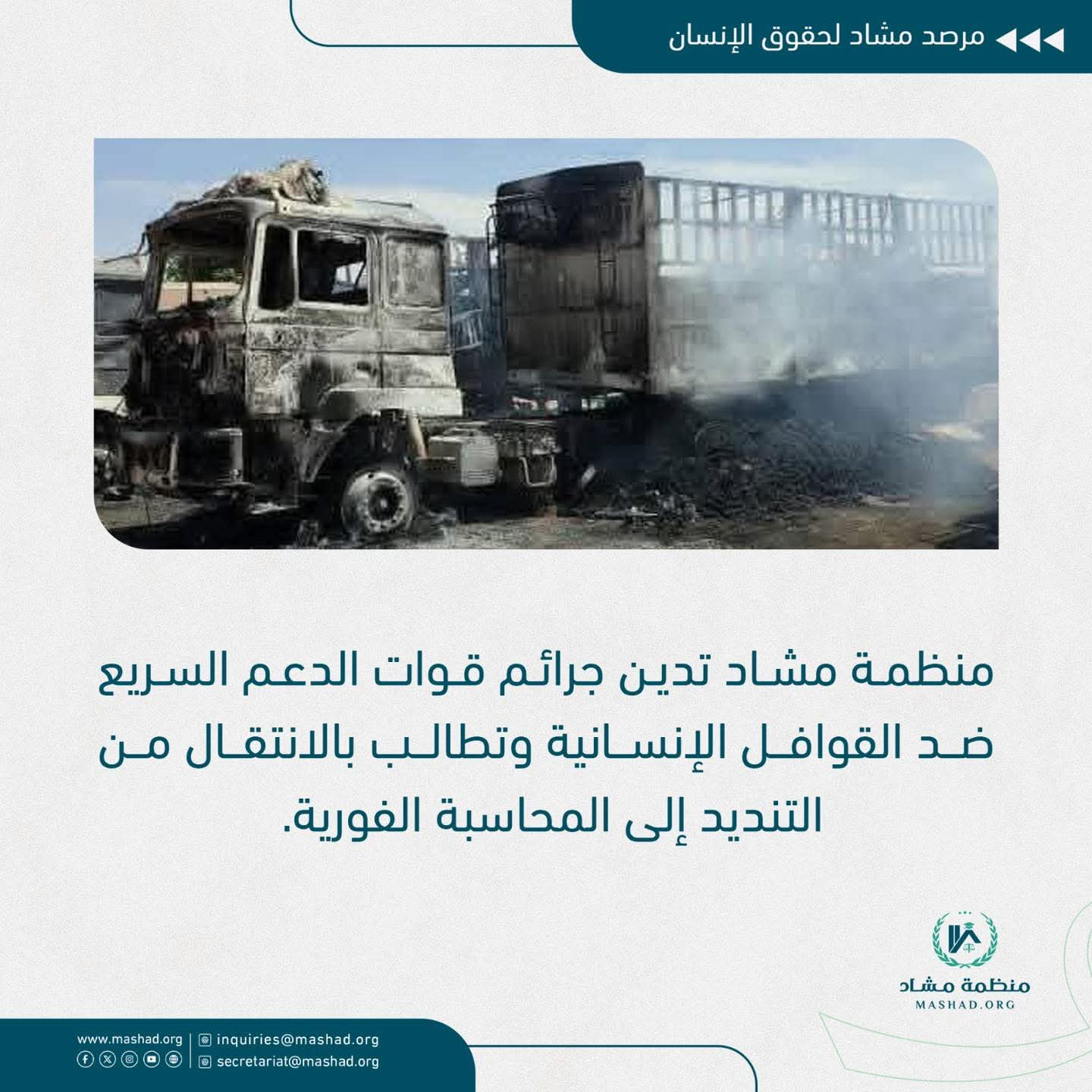 والتي كانت تحمل الغذاء والمياه والأدوية والمساعدات الطارئة لإنقاذ المدنيين المحاصرين، وخاصة الأطفال والنساء وكبار السن. إن هذا العمل العدائي يشكّل انتهاكًا صارخًا للقانون الدولي الإنساني، بما في ذلك الالتزامات المترتبة على اتفاقيات جنيف الأربع والقواعد العرفية التي تكفل حماية المدنيين والعاملين في المجال الإنساني، وضمان وصول المساعدات الإنسانية دون تهديد أو استهداف.إن استهداف قوافل الإغاثة يُعد جريمة خطيرة قد ترقى إلى جريمة حرب، ويعكس استخفافًا مروعًا بالالتزامات الدولية وحقوق الإنسان، ويؤكد غياب أي احترام لحياة الأبرياء. وتحمّل منظمة مشاد قوات الدعم السريع كامل المسؤولية القانونية والأخلاقية عن هذا العمل، وتطالب بفتح تحقيق دولي مستقل وشفاف، يضمن مساءلة جميع المتورطين وملاحقتهم قانونيًا وفق المعايير الدولية للعدالة.كما تناشد منظمة مشاد المجتمع الدولي، والأمم المتحدة، والآليات الأممية المختصة، التحرك العاجل لضمان حماية الممرات الإنسانية وتأمين وصول المساعدات دون أي تهديد، وتؤكد استمرارها في رصد الانتهاكات، وتوثيق الجرائم، والدفاع عن حقوق الضحايا حتى تحقيق العدالة وإنقاذ المدنيين من معاناتهم.