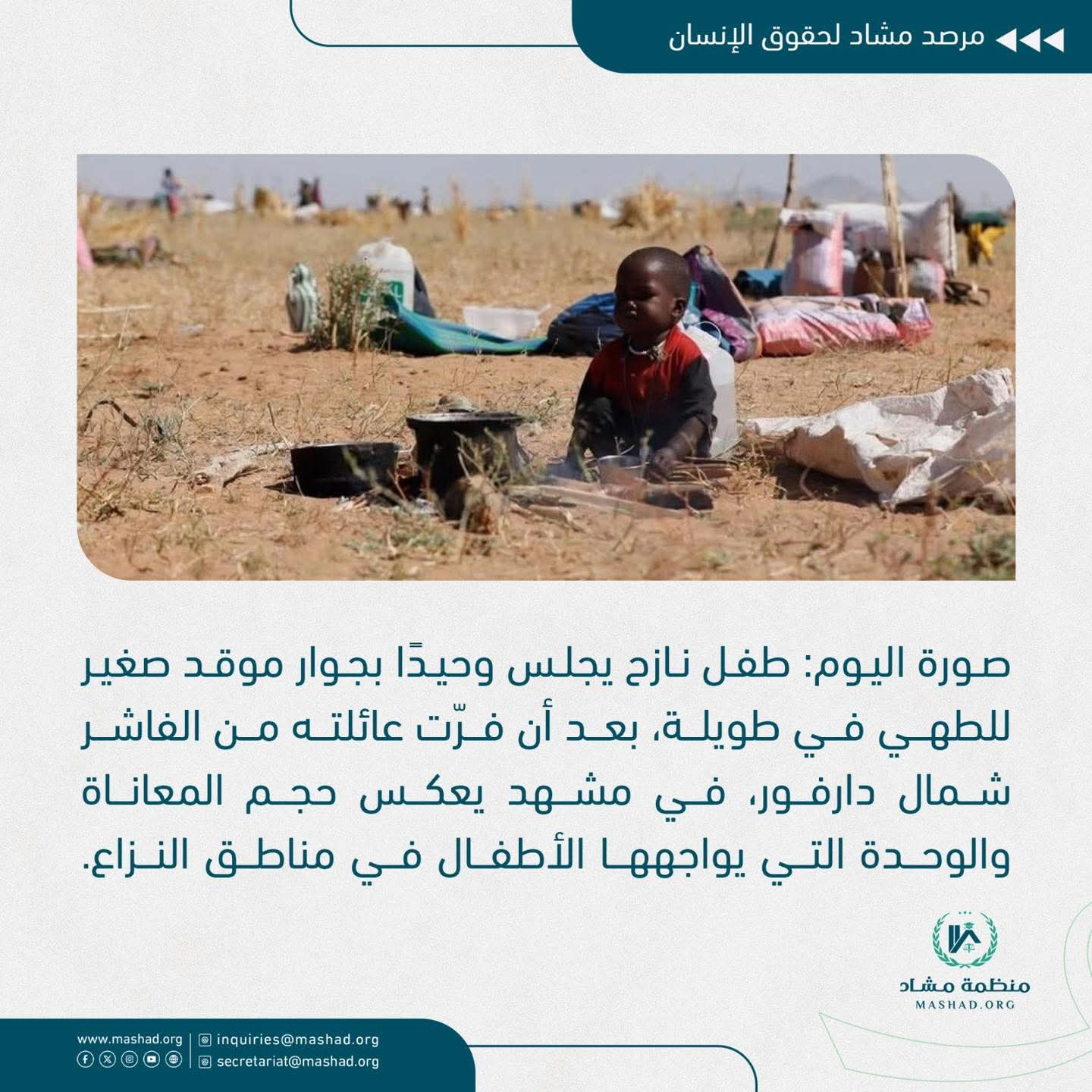 بعد أن فرّت عائلته من الفاشر شمال دارفور، في مشهد يعكس حجم المعاناة والوحدة التي يواجهها الأطفال في مناطق النزاع.