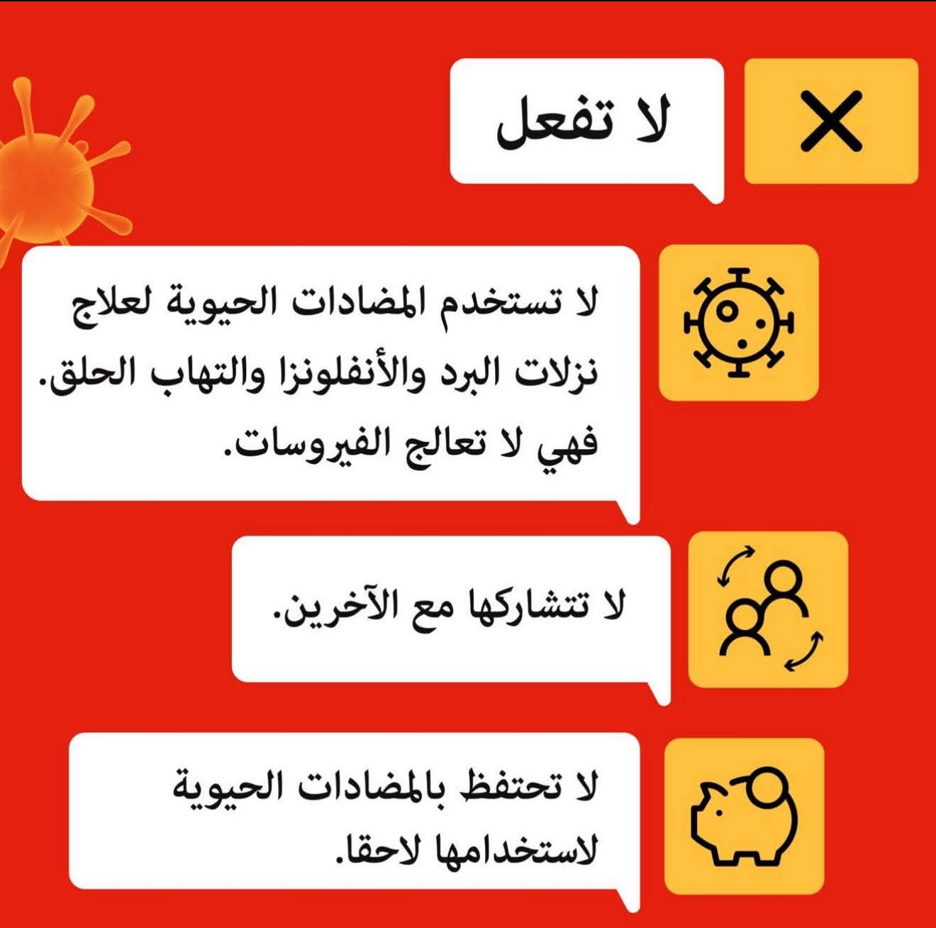 لا تستخدم المضادات الحيوية لعلاج نزلات البرد والأنفلونزا والتهاب الحلق. فهي لا تعالج الفيروسات