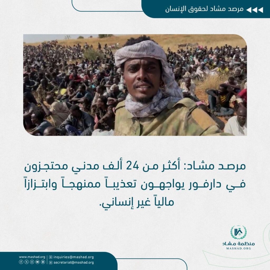 يعرب مرصد مشاد لحقوق الإنسان عن بالغ القلق إزاء المعلومات الموثوقة التي تشير إلى تعرض آلاف الشباب والرجال في الفاشر ومحيطها، لا سيما في دوامر كولقي والكومة وكتم وكبكابية، لاعتقالات تعسفية ومعاملة قاسية وتعذيب ممنهج على يد قوات الدعم السريع والميليشيات المتحالفة معها. وتؤكد الشهادات التي جمعها المرصد من الذين تمكنوا من الخروج بعد دفع الفدية أن المحتجزين يواجهون ظروفاً بالغة السوء تنتهك أبسط الحقوق الأساسية، حيث يتعرضون للتعذيب الجسدي والنفسي والإذلال المتعمد والإكراه على التواصل مع أسرهم تحت التعذيب، إضافة إلى إجبارهم على دفع مبالغ مالية طائلة كشرط لإطلاق سراحهم، في ممارسة تشكل انتهاكاً صارخاً للقانون الدولي الإنساني والقانون الدولي لحقوق الإنسان وترقى إلى مستوى الابتزاز والفدية المحظورين دولياً.