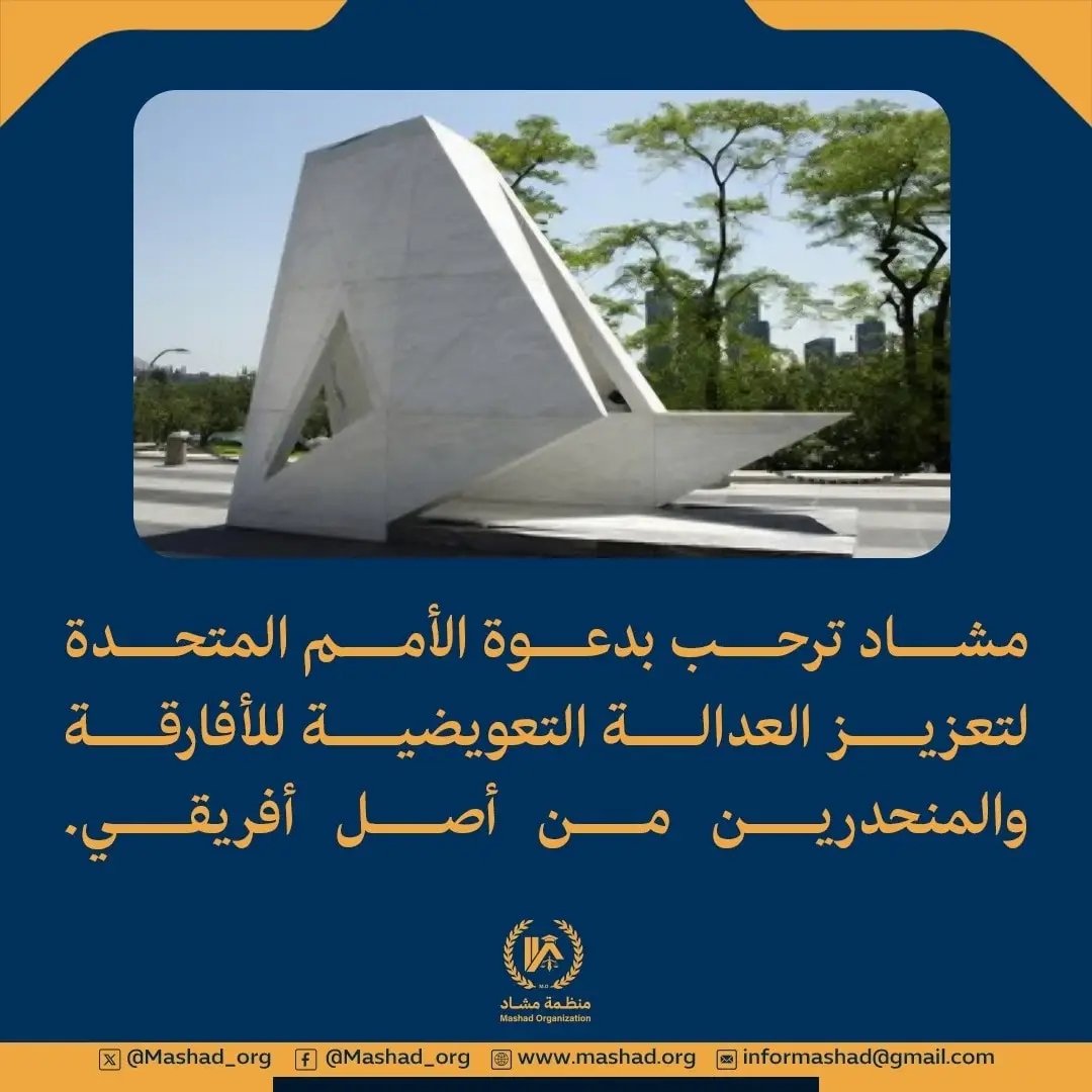 ترحب منظمة مشاد لحقوق الإنسان والتنمية الإنسانية بالدعوة الصادرة عن مكتب الأمم المتحدة لحقوق الإنسان، والتي تحث الدول والجهات المعنية على مضاعفة الجهود في سبيل تحقيق العدالة التعويضية للأفارقة وللأشخاص المنحدرين من أصل أفريقي، بما يشمل الاعتذارات الرسمية، وكشف الحقيقة، وإحياء الذاكرة، وتقديم الدعم الطبي والنفسي، إضافة إلى التعويضات بمختلف صورها.