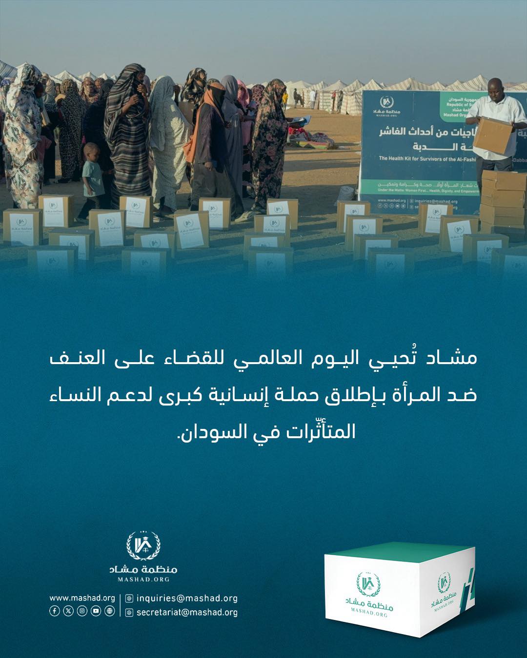 بمناسبة اليوم العالمي للقضاء على العنف ضد المرأة، دشّنت منظمة مشاد اليوم الأربعاء حملة موسعة في محلية الدبّة لدعم النساء المتأثّرات اللواتي تعرضن لانتهاكات على يد مليشيات الدعم السريع في عدد من ولايات السودان.