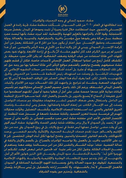 مشاد اليوم أقوى من أي وقت مضى، تواصل عملها ليس فقط في تسع ولايات، بل في ربوع السودان، وفي عدد من دول الإقليم والعالم، حيث تقدم خدمات الرعاية الصحية، والإغاثية، والدعم النفسي، ورصد الانتهاكات، والدعم القانوني للضحايا والمدنيين، وتفتح أبوابها لكل أبناء الوطن المخلصين. نحن لا نرد على الأكاذيب بالحرب، بل بالعمل، ولا نواجه المؤامرات بالصراخ، بل بالصبر والإيمان والثقة في عدالة القضية.