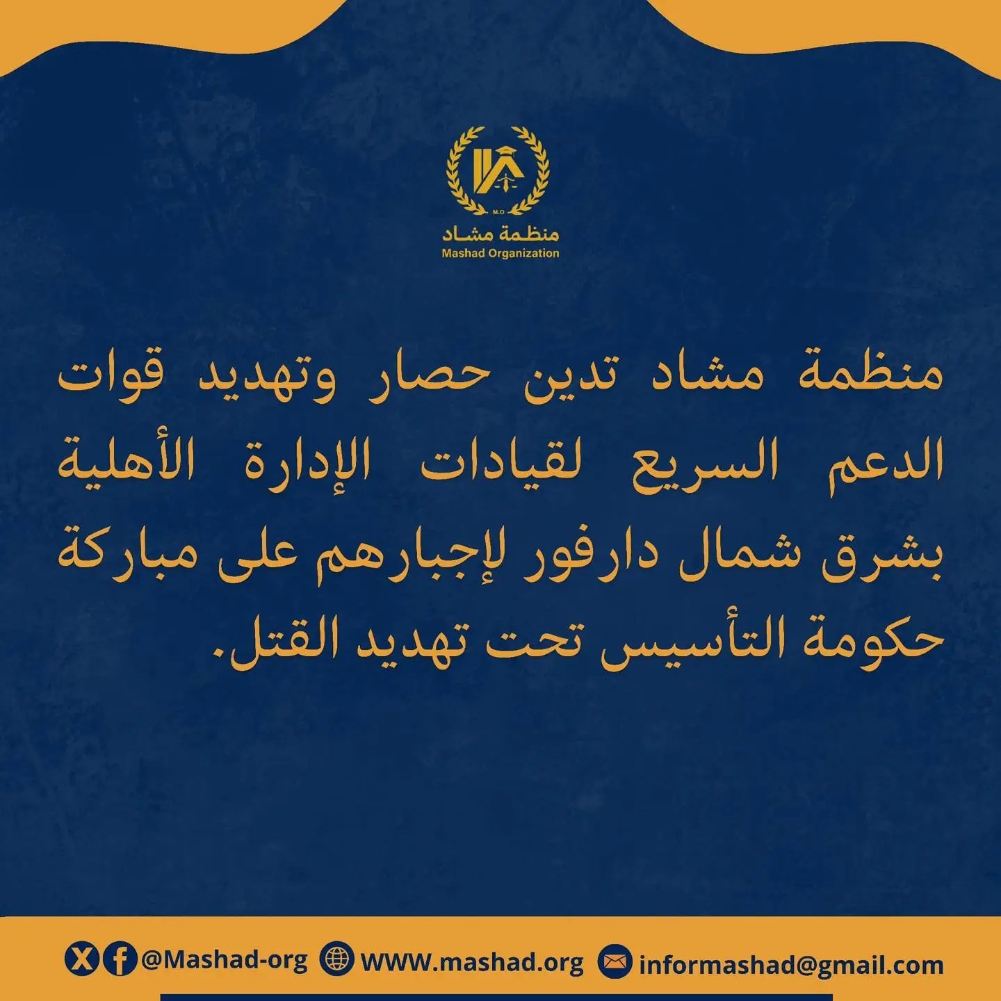 منظمة مشاد تدين حصار وتهديد قوات الدعم السريع لقيادات الإدارة الأهلية بشرق شمال دارفور لإجبارهم على مباركة حكومة التأسيس تحت تهديد القتل