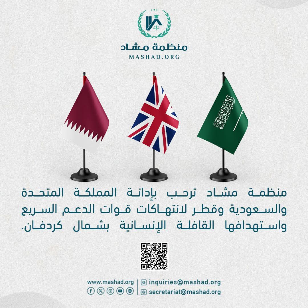 ترحب منظمة مشاد بالإدانات الصادرة عن المملكة المتحدة والمملكة العربية السعودية ودولة قطر، والتي أدانت بشكل صريح وواضح الانتهاكات الجسيمة التي ارتكبتها قوات الدعم السريع من خلال استهداف قافلة إنسانية في ولاية شمال كردفان. ويُعد هذا الفعل الإجرامي انتهاكًا خطيرًا للقانون الدولي الإنساني، وخرقًا فاضحًا للمبادئ التي تحكم حماية المدنيين والعاملين في المجال الإنساني.وتعتبر منظمة مشاد أن هذه الإدانات تمثل تحولًا نوعيًا ومهمًا نحو المسار الدولي الصحيح، لا سيما لما تضمنته من تسمية صريحة للجهة المرتكبة للجريمة. ويكتسب هذا التطور أهمية بالغة، إذ يسهم في كسر حاجز الصمت، ومواجهة سياسة الإفلات من العقاب، ويمهد الطريق نحو إنهاء الحرب المدمرة التي ما زالت تحصد أرواح الشعب السوداني، ولا سيما الأطفال والنساء وكبار السن.وتؤكد المنظمة أن الإسناد المباشر للمسؤولية إلى قوات الدعم السريع يعكس موقفًا مسؤولًا ومتقدمًا من قبل هذه الدول، ويشكل خطوة جادة نحو محاسبة الجناة قانونيًا وأخلاقيًا. وفي المقابل، فإن استمرار بعض الدول في إصدار إدانات عامة أو مبهمة، رغم وضوح الوقائع وتوافر الأدلة، يُعد شكلًا من أشكال التواطؤ غير المباشر، ويسهم فعليًا في إطالة أمد الانتهاكات وتمكين الجناة من مواصلة جرائمهم بأشكال مختلفة.وتحمّل منظمة مشاد المسؤولية القانونية والأخلاقية الكاملة لكل دولة أو جهة تتعمد الامتناع عن تسمية الجرائم ومرتكبيها، وتعتبر هذا الصمت شراكة فعلية في تقويض أمن السودان وتشجيعًا مباشرًا لقوات الدعم السريع على الاستمرار في ارتكاب الانتهاكات الجسيمة بحق المدنيين.وتدعو المنظمة المجتمع الدولي والدول ذات التأثير إلى تبني نهج مسؤول قائم على تسمية الجرائم ومرتكبيها بوضوح، واتخاذ خطوات عملية تتجاوز حدود الإدانة الخطابية، بما في ذلك دعم آليات المساءلة الدولية، وملاحقة قوات الدعم السريع قضائيًا، ومحاسبة جميع الدول والجهات التي تقدم لها الدعم السياسي أو العسكري أو المالي.كما تحث منظمة مشاد الهيئات الحقوقية والقانونية الدولية والإقليمية على الوقوف إلى جانب الشعب السوداني، ودعم الضحايا، وضمان حماية المدنيين، والعمل على استعادة الأمن والاستقرار والسلام في السودان.وتجدد المنظمة التزامها الراسخ بالعمل من أجل إعادة بناء ما دمرته الحرب، وتحقيق التطلعات المشروعة للشعب السوداني في إقامة دولة مدنية ديمقراطية قائمة على الحرية والعدالة والمساواة والمواطنة المتساوية، وإنهاء جميع أشكال العنف والانتهاكات التي لا مكان لها في الإنسانية ولا في القيم الدولية المعاصرة.