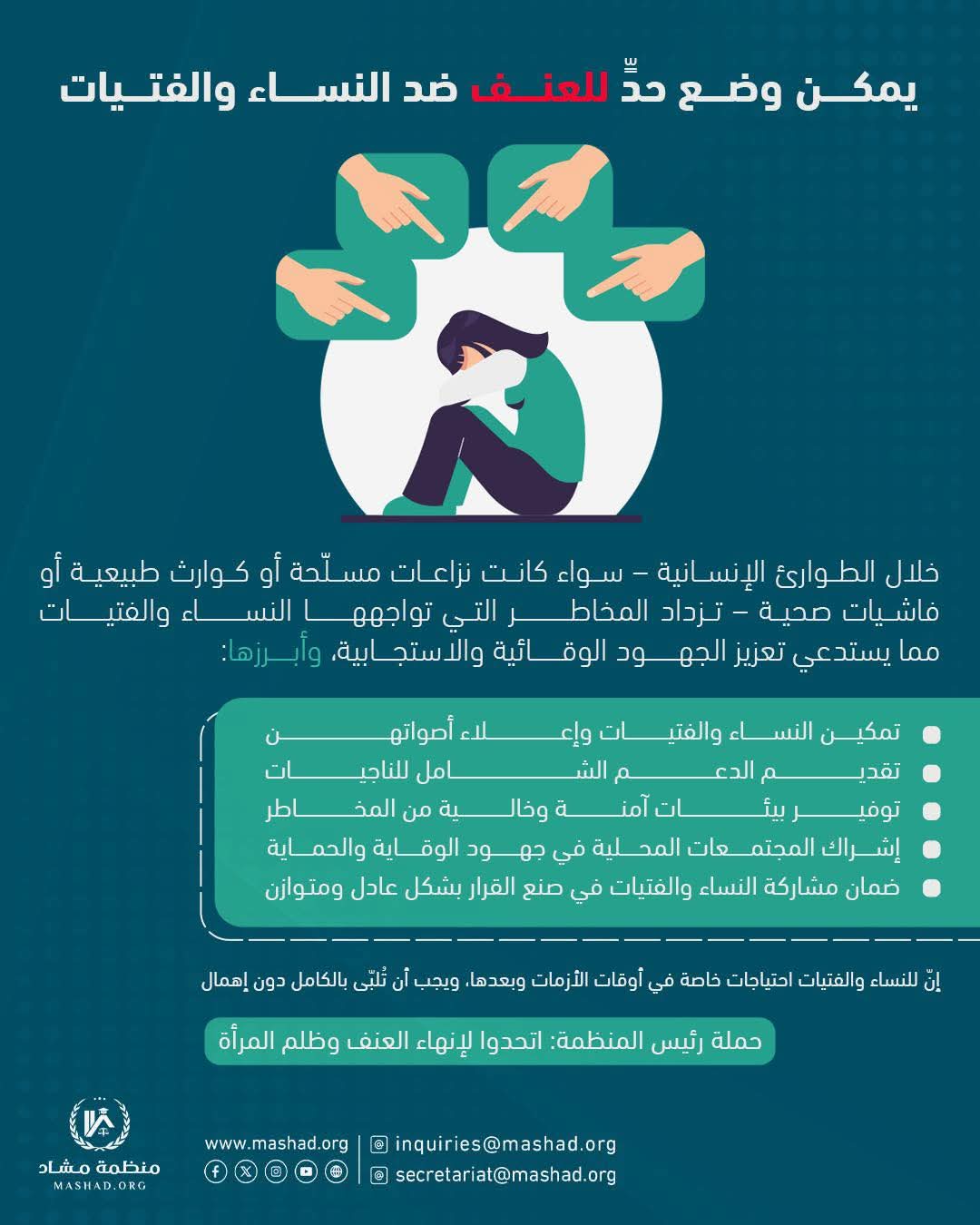Home التوعية يمكن وضع حدٍّ للعنف ضد النساء والفتيات.⚠️خلال الطوارئ الإنسانية – سواء كانت نزاعات مسلّحة أو كوارث طبيعية أو فاشيات صحية – تزداد المخاطر التي تواجهها النساء والفتيات، مما يستدعي تعزيز الجهود الوقائية والاستجابية، وأبرزها:🔶 تمكين النساء والفتيات وإعلاء أصواتهن🔶 تقديم الدعم الشامل للناجيات🔶 توفير بيئات آمنة وخالية من المخاطر🔶 إشراك المجتمعات المحلية في جهود الوقاية والحماية🔶 ضمان مشاركة النساء والفتيات في صنع القرار بشكل عادل ومتوازنإنّ للنساء والفتيات احتياجات خاصة في أوقات الأزمات وبعدها، ويجب أن تُلبّى بالكامل دون إهمال.