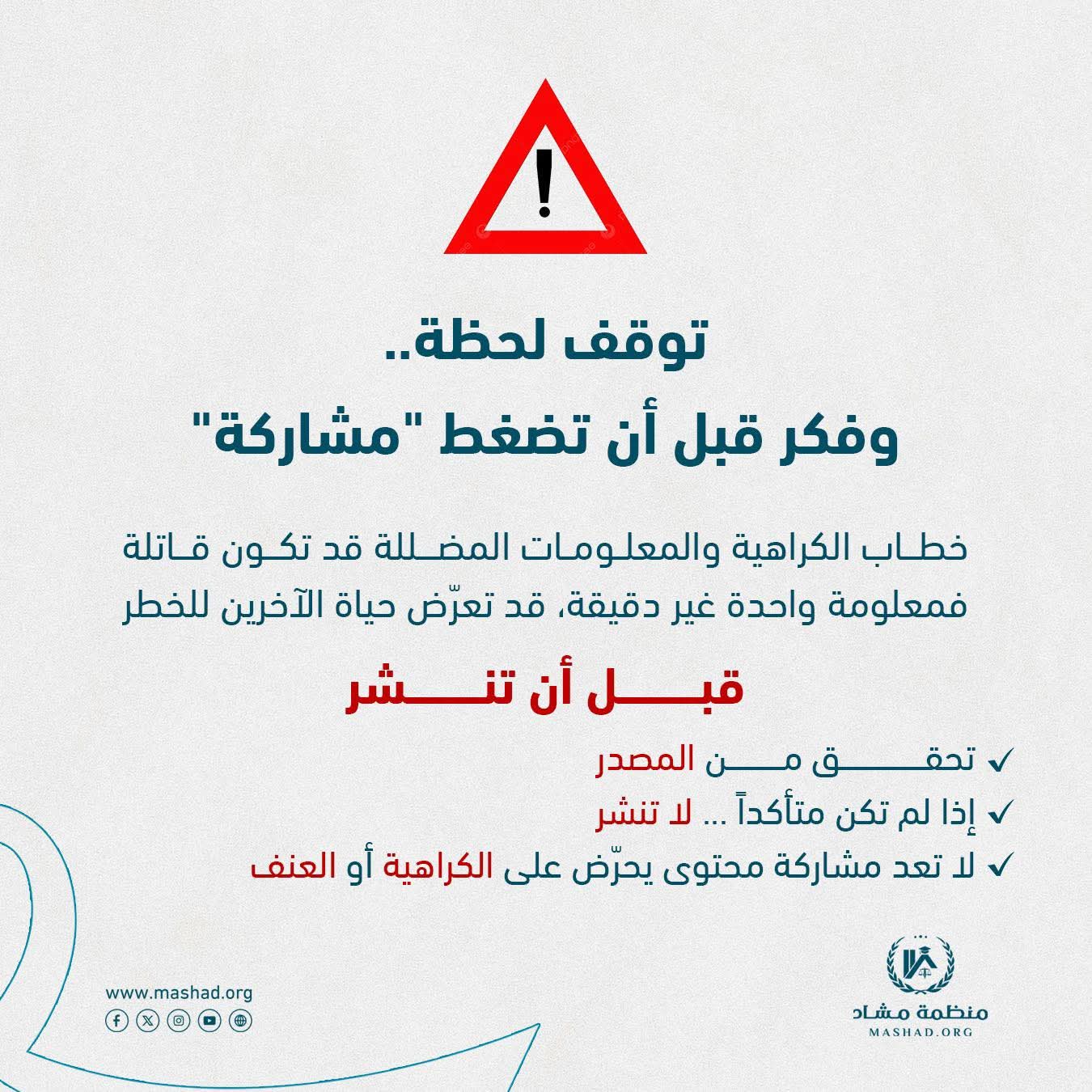 وتزيد من العنف داخل المجتمعات.⭕️قبل أن تشارك أي خبر أو منشور، خذ لحظة للتأكّد من صحّته ✅.⭕️مشاركتك الواعية يمكن أن تحمي الآخرين من الأذى.#منظمة_مشاد