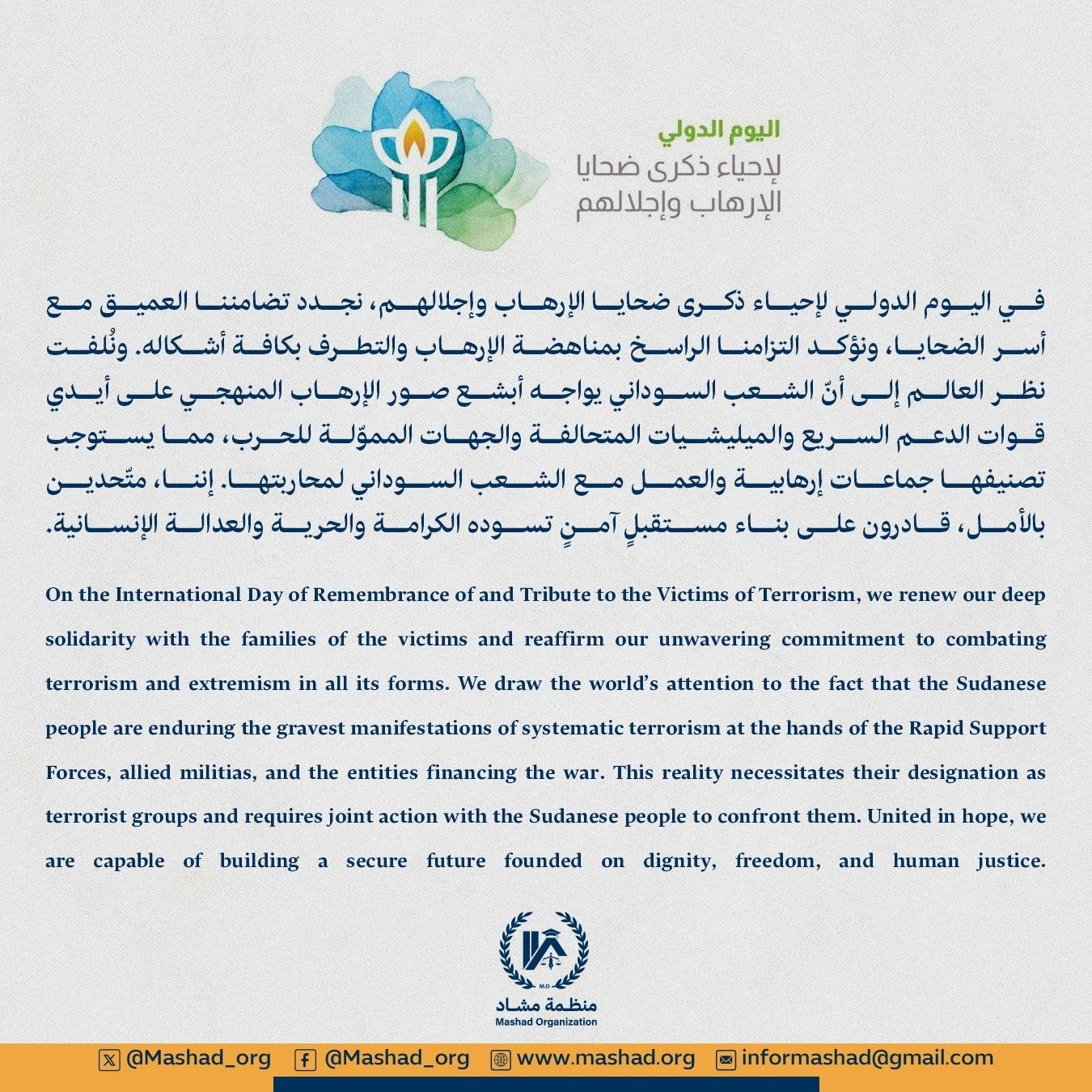 We draw the world’s attention to the fact that the Sudanese people are enduring the gravest manifestations of systematic terrorism at the hands of the Rapid Support Forces, allied militias, and the entities financing the war. This reality necessitates their designation as terrorist groups and requires joint action with the Sudanese people to confront them.
