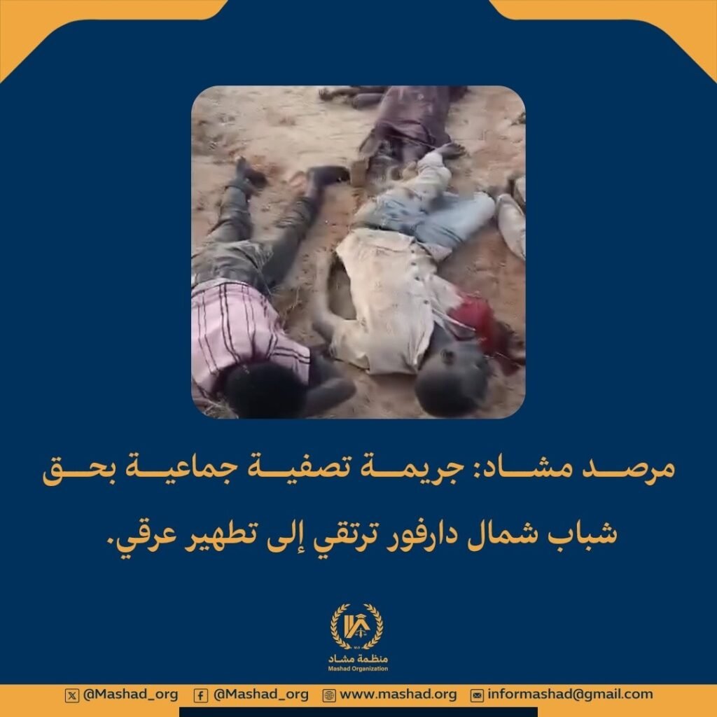 يعرب مرصد مشاد عن إدانته البالغة واستنكاره الشديد للجريمة المروعة التي ارتكبتها صباح اليوم قوات الدعم السريع والميليشيات المتحالفة معها بحق أكثر من 16 شاباً من أبناء شمال دارفور، في واقعة ترقى إلى جريمة تطهير عرقي موصوفة، وانتهاك فادح للقانون الدولي الإنساني والقانون الدولي لحقوق الإنسان، ومبادئ الحماية المنصوص عليها في اتفاقيات جنيف، وميثاق روما الأساسي للمحكمة الجنائية الدولية