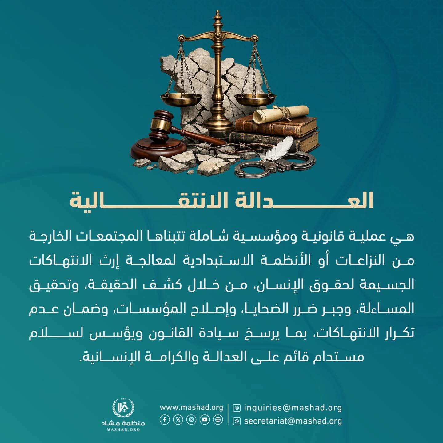 Home التوعية ⭕️ العدالة الانتقالية هي عملية قانونية ومؤسسية شاملة تتبناها المجتمعات الخارجة من النزاعات أو الأنظمة الاستبدادية لمعالجة إرث الانتهاكات الجسيمة لحقوق الإنسان، من خلال كشف الحقيقة، وتحقيق المساءلة، وجبر ضرر الضحايا، وإصلاح المؤسسات، وضمان عدم تكرار الانتهاكات، بما يرسخ سيادة القانون ويؤسس لسلام مستدام قائم على العدالة والكرامة الإنسانية.