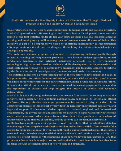 Mashad calls upon all young Sudanese men and women from across the country to take the initiative and register for this ambitious national program through its offices and official platforms. The organization also urges government institutions to play an active role in ensuring the success of this project by providing the necessary institutional, legislative, and logistical support. Furthermore, Mashad appeals to national, regional, and international organizations, the private sector, and development partners to support and contribute to this constructive endeavor, which stems from a firm belief that youth are the nucleus of transformation, the anchors of stability, and the gateway to a modern, inclusive state.