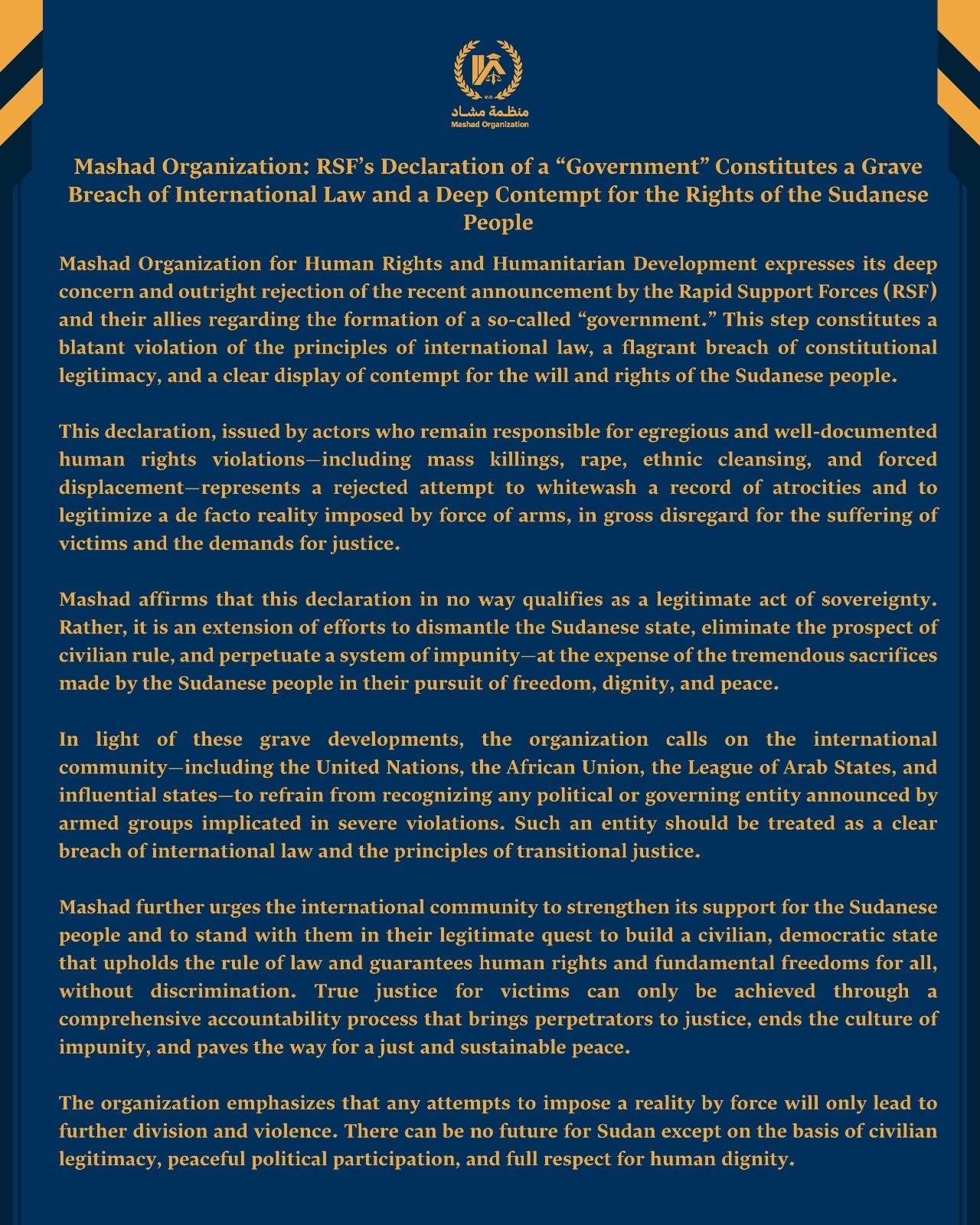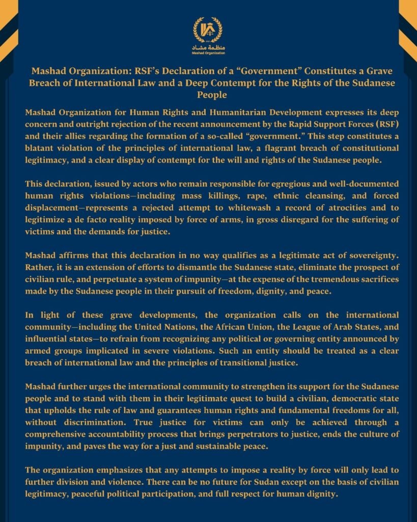 Mashad Organization for Human Rights and Humanitarian Development expresses its deep concern and outright rejection of the recent announcement by the Rapid Support Forces (RSF) and their allies regarding the formation of a so-called “government.” This step constitutes a blatant violation of the principles of international law, a flagrant breach of constitutional legitimacy, and a clear display of contempt for the will and rights of the Sudanese people.