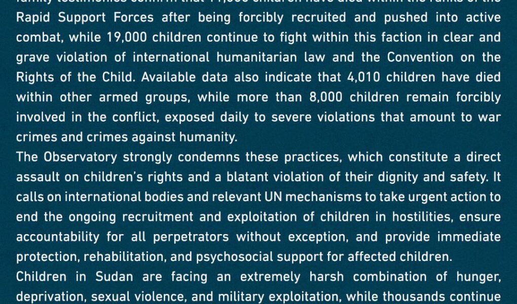 مرصد مشهد لحقوق الإنسان يعرب عن بالغ قلقه من التدهور المروع في وضع الأطفال في السودان. نتائج الرصد الميداني والشهادات العائلية تؤكد وفاة 11000 طفل ضمن صفوف قوات الدعم السريع