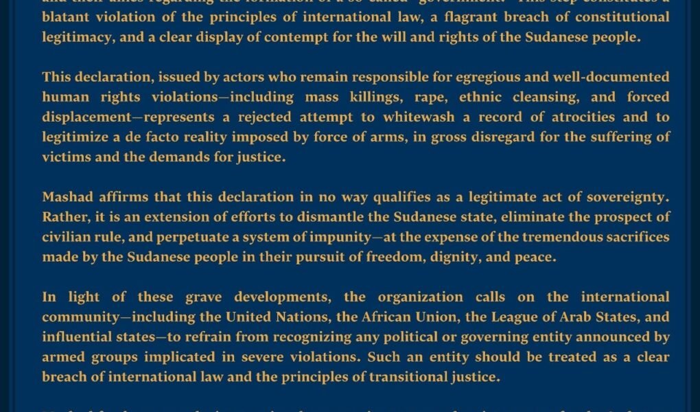 ⭕️Mashad Organization: RSF’s Declaration of a “Government” Constitutes a Grave Breach of International Law and a Deep Contempt for the Rights of the Sudanese People⭕️