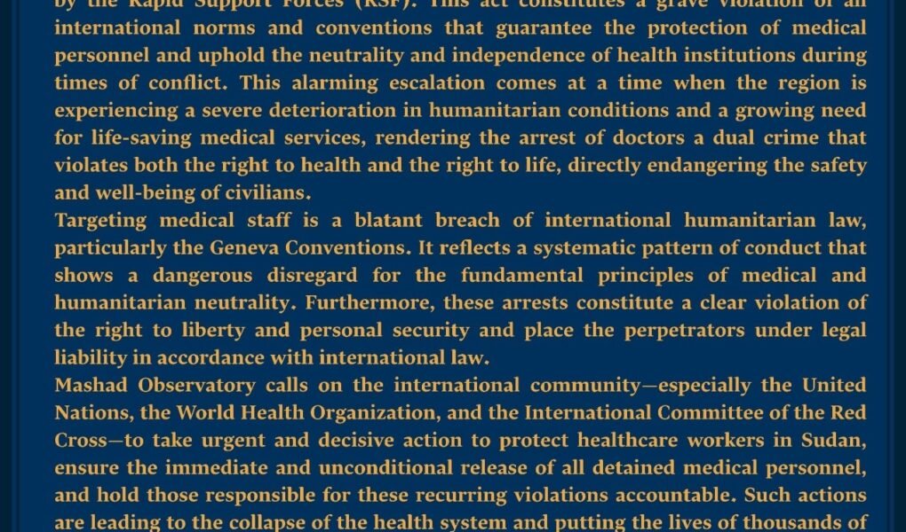 ⭕️Mashad Observatory Condemns the Targeting of Medical Personnel in Nyala and Calls for Urgent Action to Protect Them and Hold Perpetrators Accountable⭕️ Mashad Human Rights Observatory expresses its strong condemnation