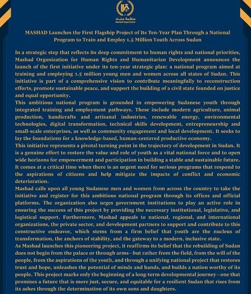 ⭕️MASHAD Launches the First Flagship Project of Its Ten-Year Plan Through a National Program to Train and Employ 1.5 Million Youth Across Sudan⭕️