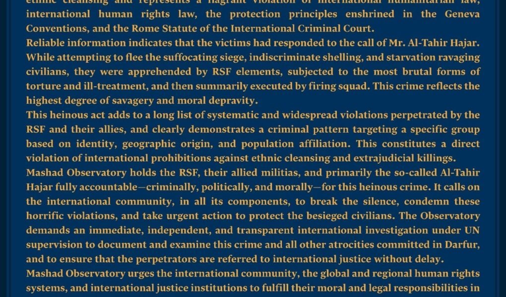 Mashad Observatory expresses its grave condemnation and strong denunciation of the horrific crime committed this morning by the Rapid Support Forces (RSF) and their allied militias against more than 16