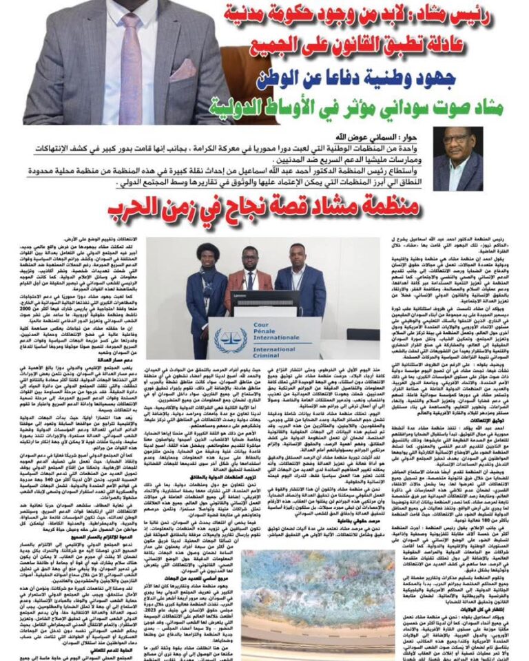 ⭕️ لا يفوتكم الاطلاع على الحوار المهم مع رئيس منظمة مشاد عبر الحاكم نيوز، والذي يسلط الضوء على أبرز القضايا الوطنية ويعرض رؤية المنظمة وجهودها في دعم قضايا الشعب السودانيإن بناء دولة مستقرة وعادلة يتطلب قيام حكومة مدنية رشيدة تُعلي من سيادة حكم القانون وتطبقه على الجميع دون استثناء، بما يكفل تحقيق العدالة والمساواة وصون حقوق المواطنين#منظمة_مشاد