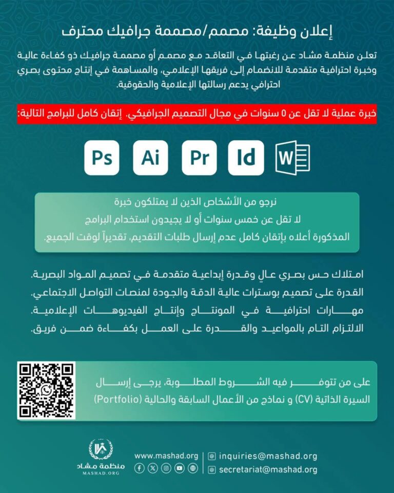 ⭕️إعلان وظيفة: مصمم/مصممة جرافيك محترف⭕️تعلن منظمة مشاد عن رغبتها في التعاقد مع مصمم أو مصممة جرافيك ذو كفاءة عالية وخبرة احترافية متقدمة للانضمام إلى فريقها الإعلامي، والمساهمة في إنتاج محتوى بصري احترافي يدعم رسالتها الإعلامية والحقوقية.المتطلبات الأساسية: • خبرة عملية لا تقل عن 5 سنوات في مجال التصميم الجرافيكي. • إتقان كامل للبرامج التالي⭕️ Ps Ai Pr Id • امتلاك حس بصري عالٍ وقدرة إبداعية متقدمة في تصميم المواد البصرية. • القدرة على تصميم بوسترات عالية الدقة والجودة لمنصات التواصل الاجتماعي. • مهارات احترافية في المونتاج وإنتاج الفيديوهات الإعلامية. • الالتزام التام بالمواعيد والقدرة على العمل بكفاءة ضمن فريق.تنويه مهم:نرجو من الأشخاص الذين لا يمتلكون خبرة لا تقل عن خمس سنوات أو لا يجيدون استخدام البرامج المذكورة أعلاه بإتقان كامل عدم إرسال طلبات التقديم، تقديراً لوقت الجميع.طريقة التقديم:على من تتوفر فيه الشروط المطلوبة، يرجى إرسال: • السيرة الذاتية (CV) • نماذج من الأعمال السابقة والحالية (Portfolio)#منظمة_مشاد