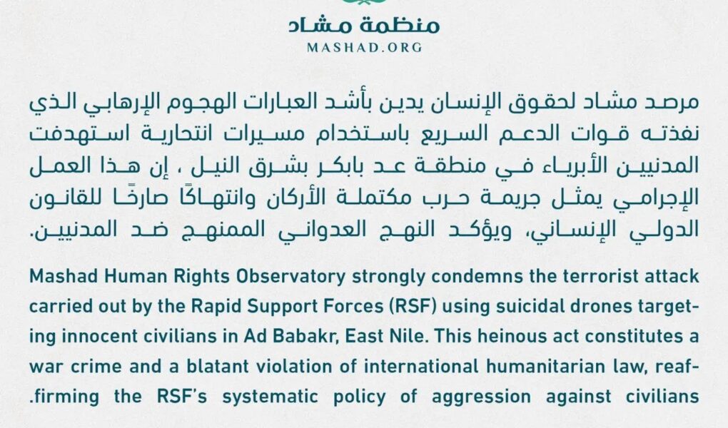 مرصد مشاد لحقوق الإنسان يدين بأشد العبارات الهجوم الإرهابي الذي نفذته قوات الدعم السريع باستخدام مسيرات انتحارية استهدفت المدنيين الأبرياء في منطقة عد بابكر بشرق النيل. إن هذا العمل الإجرامي