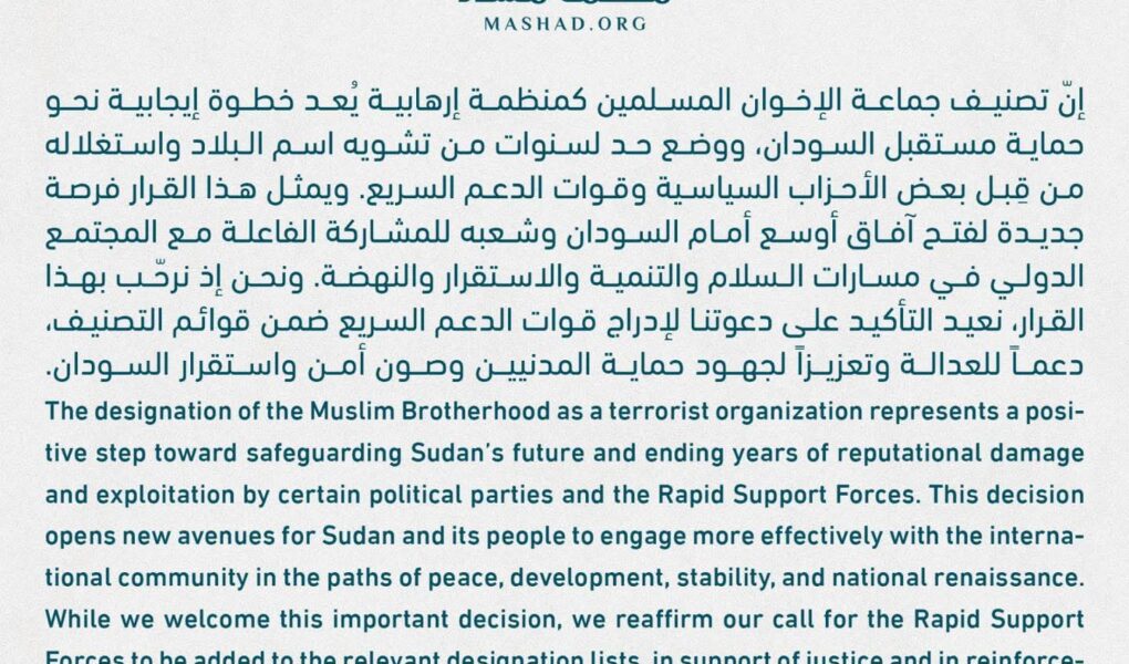 ونحن إذ نرحّب بهذا القرار، نعيد التأكيد على دعوتنا لإدراج قوات الدعم السريع ضمن قوائم التصنيف، دعماً للعدالة وتعزيزاً لجهود حماية المدنيين وصون أمن واستقرار السودان. The designation of the