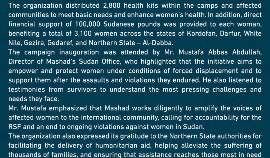 بمناسبة اليوم العالمي للقضاء على العنف ضد المرأة، دشّنت منظمة مشاد اليوم الأربعاء حملة موسعة في محلية الدبّة لدعم النساء المتأثّرات اللواتي تعرضن لانتهاكات على يد مليشيات الدعم السريع في