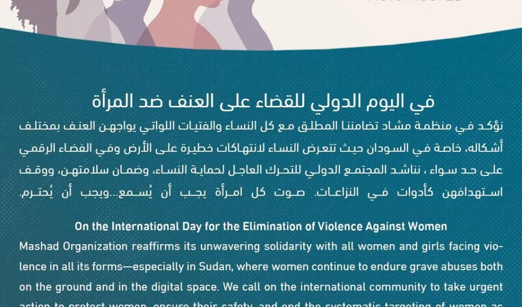 نناشد المجتمع الدولي للتحرك العاجل لحماية النساء، وضمان سلامتهن، ووقف استهدافهن كأدوات في النزاعات.صوت كل امرأة يجب أن يُسمع… ويجب أن يُحترم. On the International Day for the Elimination of