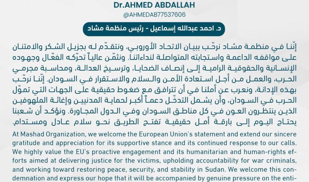 ونثمّن عالياً تحرّكه الفعّال وجهوده الإنسانية والحقوقية الرامية إلى إنصاف الضحايا، وترسيخ العدالة، ومحاسبة مجرمي الحرب، والعمل من أجل استعادة الأمن والسلام والاستقرار في السودان.إنّنا نرحّب بهذه الإدانة، ونعرب عن