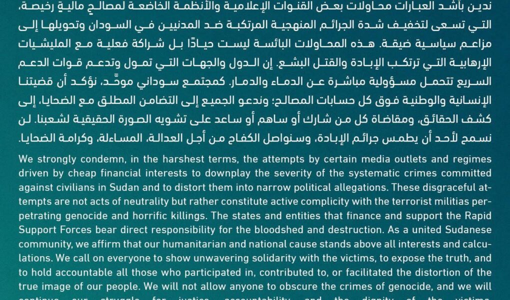 هذه المحاولات البائسة ليست حيادًا بل شراكة فعلية مع المليشيات الإرهابية التي ترتكب الإبادة والقتل البشع. إن الدول والجهات التي تمول وتدعم قوات الدعم السريع تتحمل مسؤولية مباشرة عن الدماء
