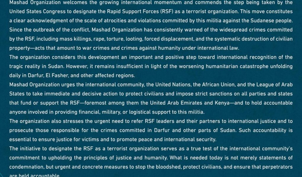 ترحب منظمة مشاد بالتحركات الدولية المتنامية، وتثمن الخطوة الرامية التي يتخذها الكونغرس الأمريكي لتصنيف قوات الدعم السريع منظمة إرهابية، باعتبارها اعترافًا واضحًا بحجم الفظائع والانتهاكات التي ارتكبتها هذه المليشيا ضد