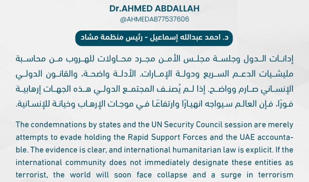 The condemnations by states and the UN Security Council session are merely attempts to evade holding the Rapid Support Forces and the UAE accountable. The evidence is clear, and international