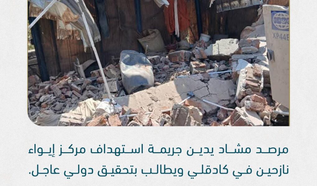 يدين مرصد مشاد بأشد العبارات الجريمة المروعة التي ارتكبتها قوات الدعم السريع اليوم الجمعة عبر طائرة مسيّرة استهدفت مركز إيواء للنازحين في حي كلبا بمدينة كادقلي – ولاية جنوب كردفان.أسفر