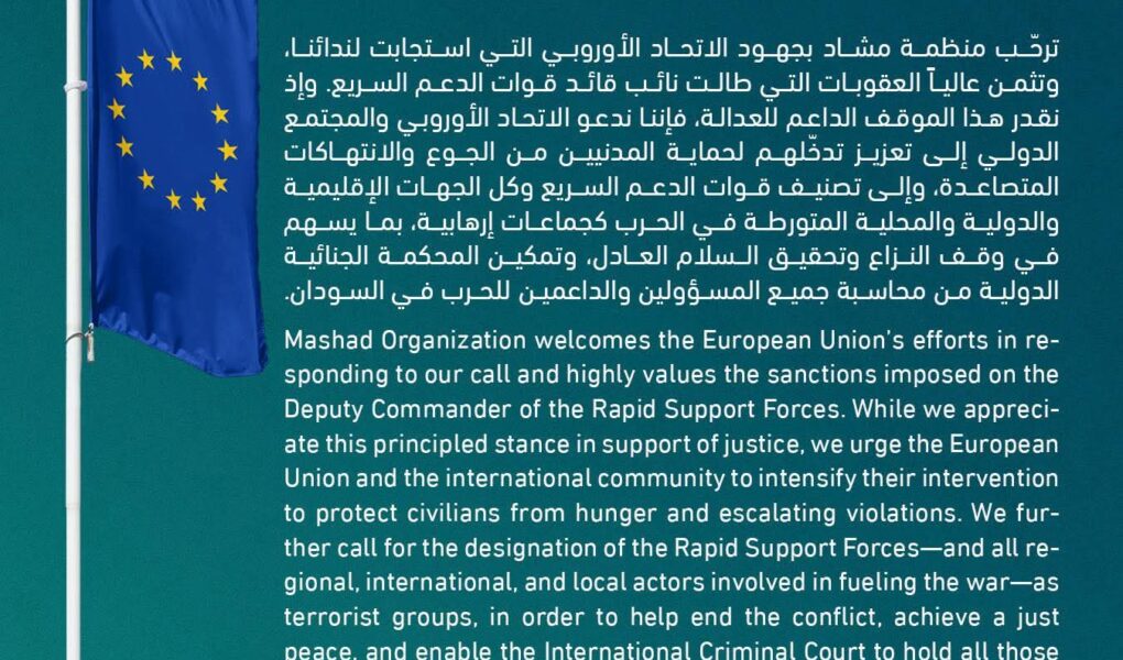 وإذ نقدر هذا الموقف الداعم للعدالة، فإننا ندعو الاتحاد الأوروبي والمجتمع الدولي إلى تعزيز تدخّلهم لحماية المدنيين من الجوع والانتهاكات المتصاعدة، وإلى تصنيف قوات الدعم السريع وكل الجهات الإقليمية والدولية