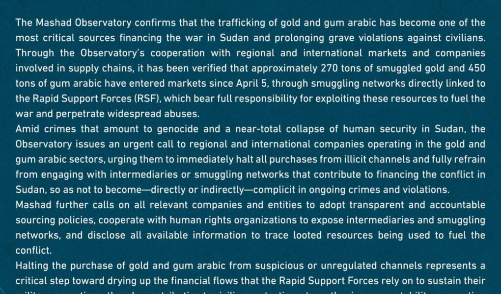 يؤكد مرصد مشاد أن تهريب الذهب والصمغ العربي أصبح من أخطر الموارد التي تُموّل الحرب في السودان وتطيل أمد الانتهاكات الجسيمة بحق المدنيين. ومن خلال تعاون المرصد مع أسواق إقليمية