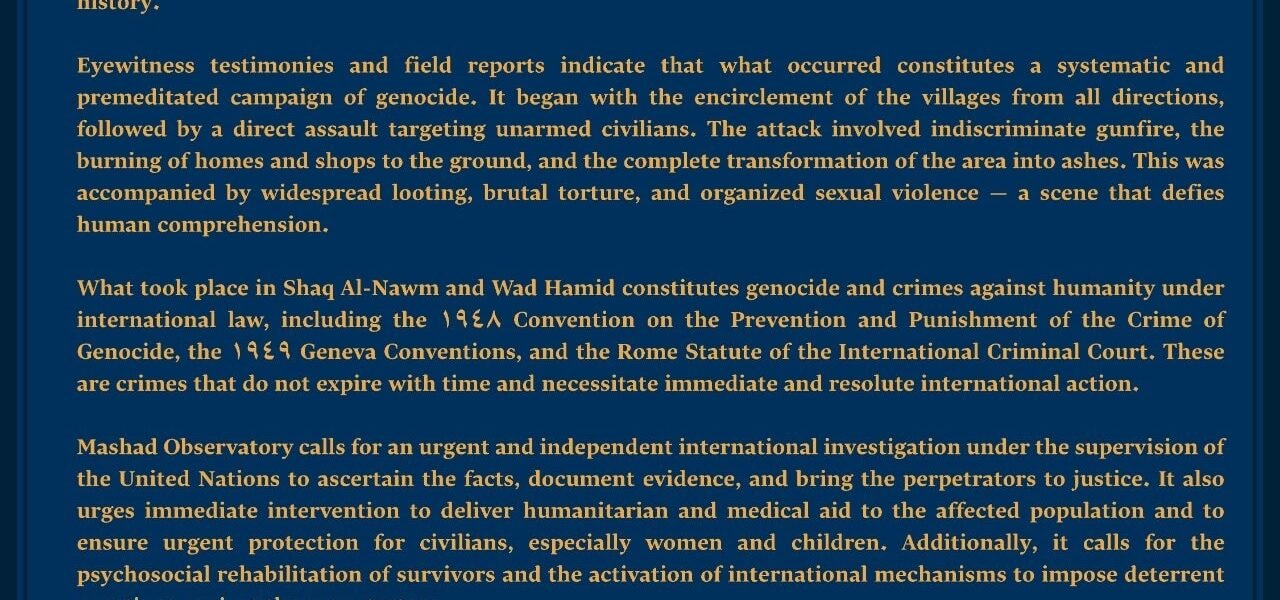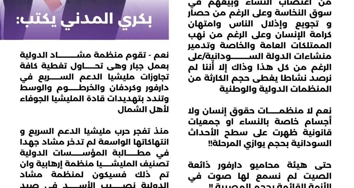 إنها شهادة نعتز ونفخر بها في منظمة مشاد، ونتوجه بخالص الشكر والتقدير للأستاذ الاعلامي بكري المدني صاحب القلم الوطني الأصيل والمواقف المشرفة، ولكل من ساندنا ووقف معنا في إيصال رسالتنا،.