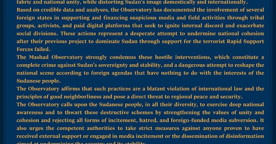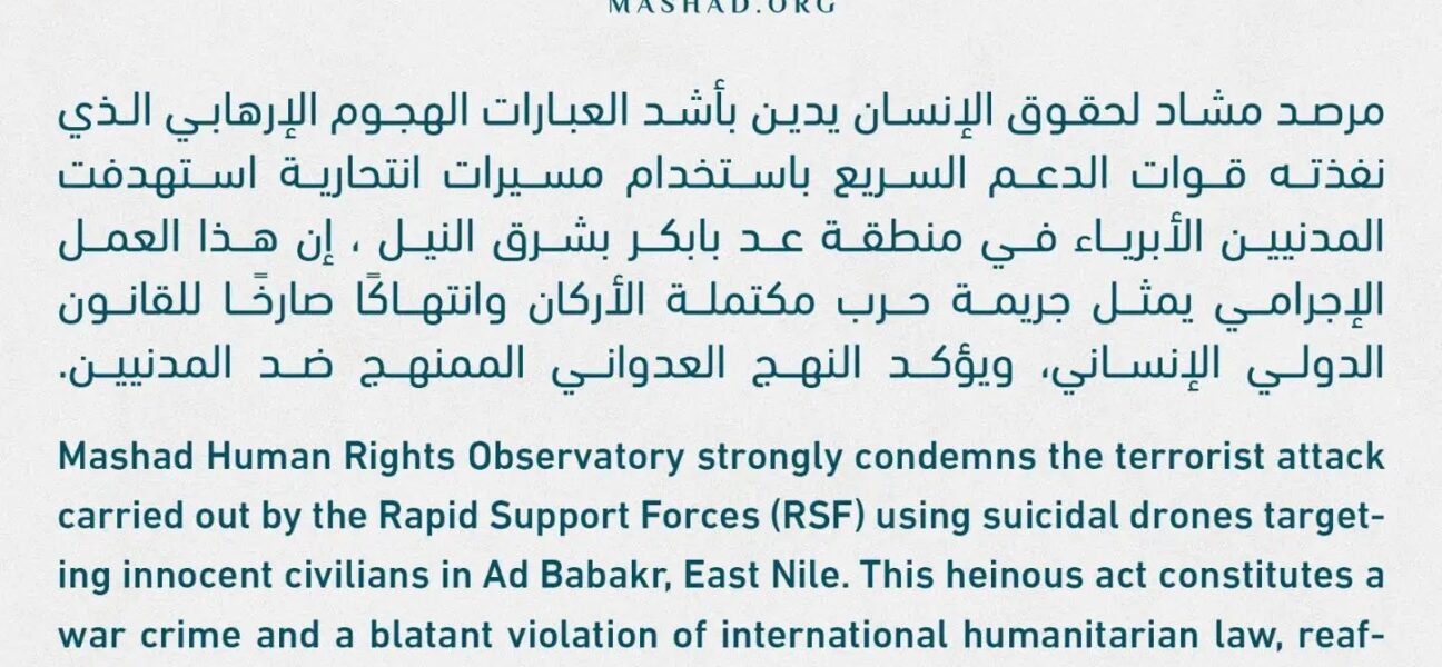 مرصد مشاد: استهداف المدنيين وزعماء الإدارة الأهلية في شمال كردفان جريمة ضد الإنسانية تكشف التوجّه الخطير لقوات الدعم السريع نحو تصفية القبائل الرافضة للحرب يدين مرصد مشاد بأشد العبارات الجريمة.