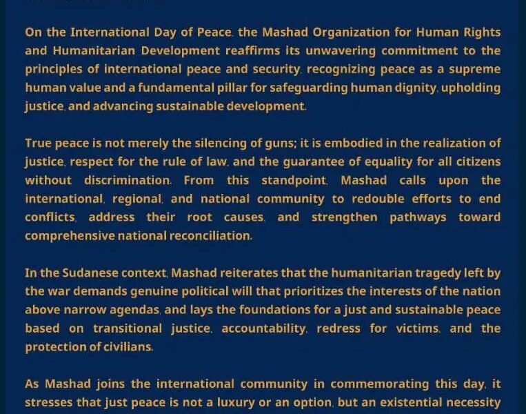 On the International Day of Peace: Mashad Calls for a Just and Sustainable Peace in Sudan and the World On the International Day of Peace, the Mashad Organization for Human.