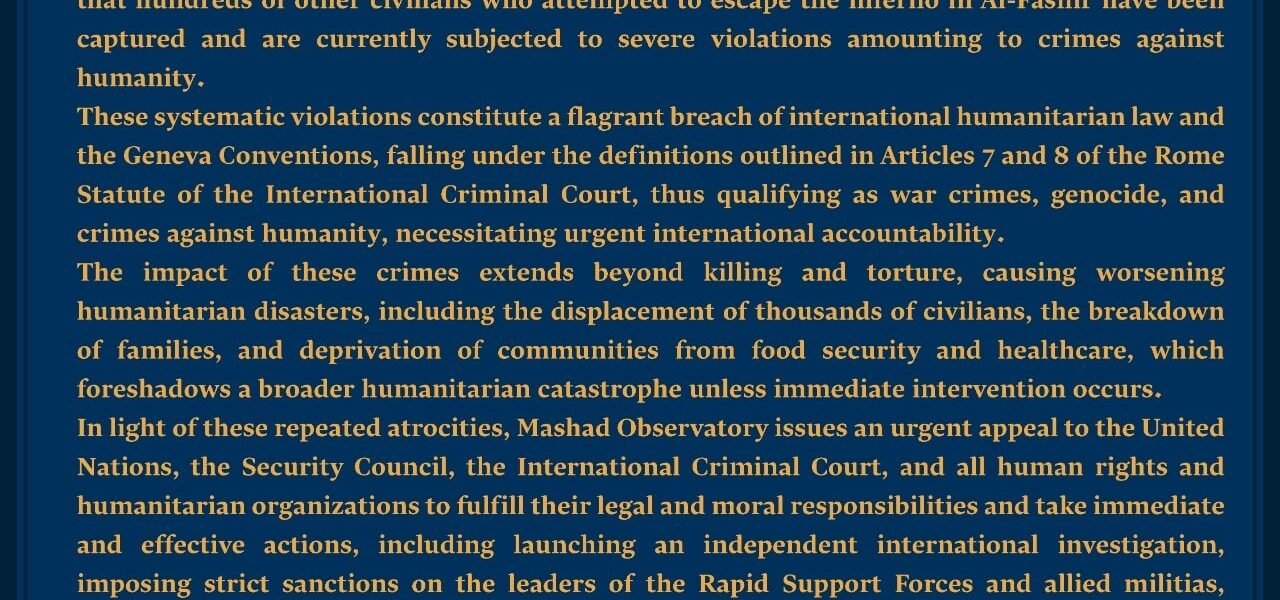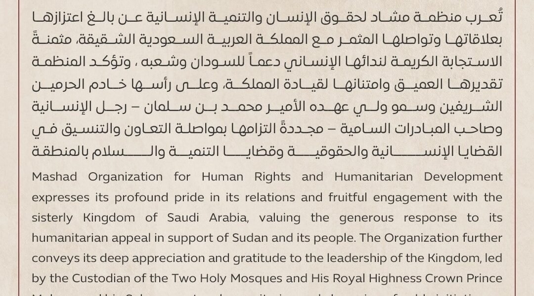 تُعرب منظمة مشاد لحقوق الإنسان والتنمية الإنسانية عن بالغ اعتزازها بعلاقاتها وتواصلها المثمر مع المملكة العربية السعودية الشقيقة، مثمنةً الاستجابة الكريمة لندائها الإنساني دعماً للسودان وشعبه.