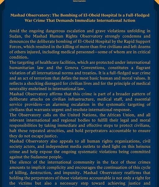 تدين منظمة مشاد بأشد العبارات الجريمة المروّعة التي أدّت إلى وفاة الصحفي النور سليمان النور متأثراً بجراحه في مدينة الفاشر، جراء القصف العشوائي الذي نفذته قوات الدعم السريع على الأحياء.