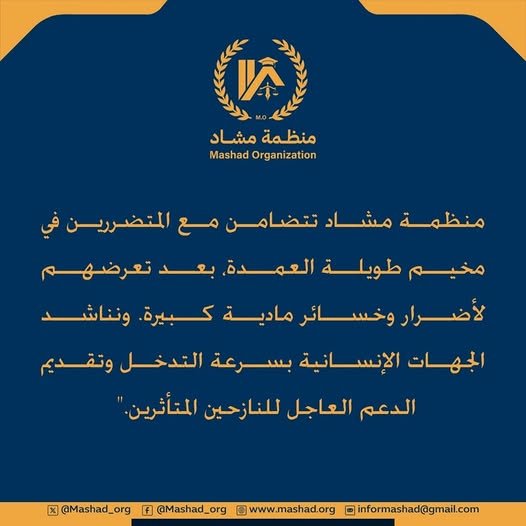 منظمة مشاد تتضامن مع المتضررين في مخيم طويلة العمدة، بعد تعرضهم لأضرار وخسائر مادية كبيرة. ونناشد الجهات الإنسانية بسرعة التدخل وتقديم الدعم العاجل للنازحين المتأثرين.#منظمة_مشاد