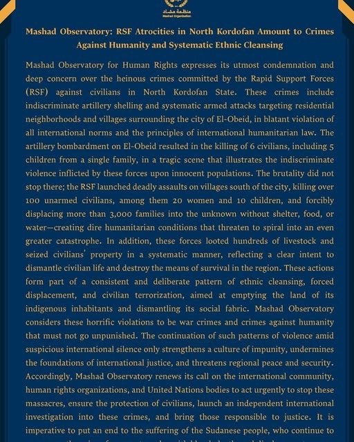 Mashad Observatory for Human Rights expresses its utmost condemnation and deep concern over the heinous crimes committed by the Rapid Support Forces (RSF) against civilians in North Kordofan State. These crimes include indiscriminate artillery shelling and systematic armed attacks targeting residential neighborhoods and villages surrounding the city of El-Obeid, in blatant violation of all international norms and the principles of international humanitarian law.