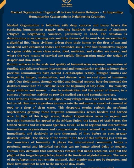 Mashad Organization is following with deep concern and heavy hearts the escalating humanitarian tragedy affecting hundreds of thousands of Sudanese refugees in neighboring countries, particularly in Chad. The situation is deteriorating at an alarming rate amid the absence of the most basic necessities for a dignified life. These civilians, driven from their homes by the fires of war and burdened with exhausted bodies and wounded souls, now find themselves trapped in a grim reality where clean water, food, medicine, and shelter are scarce, and where the very means of survival are rapidly disintegrating under the weight of despair and slow death.