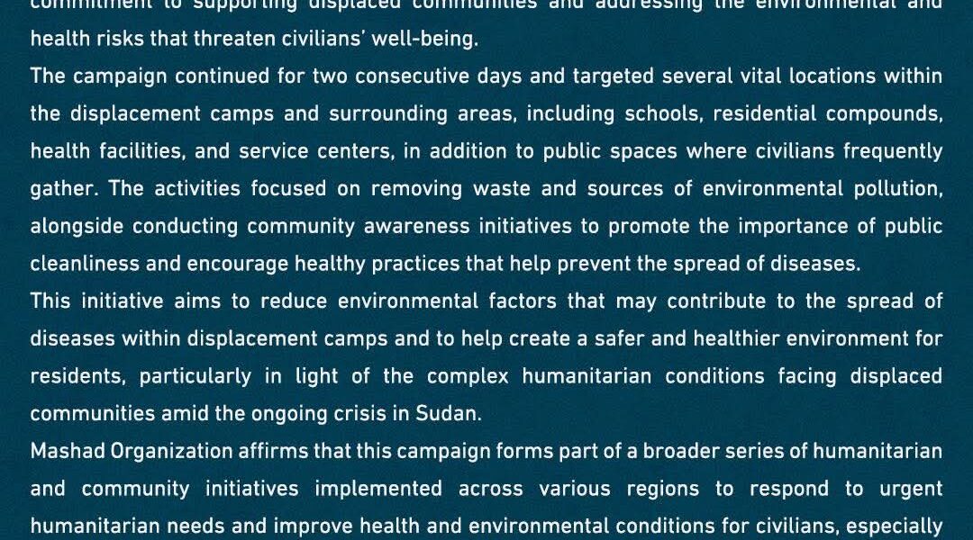 نفذت منظمة مشاد حملة توعوية وتنظيفية واسعة النطاق لحماية البيئة وتعزيز الصحة العامة في محلية الدبة (معسكرات النازحين) بالولاية الشمالية، وذلك في إطار التزامها المتواصل بدعم المجتمعات المتأثرة بالنزوح والعمل.