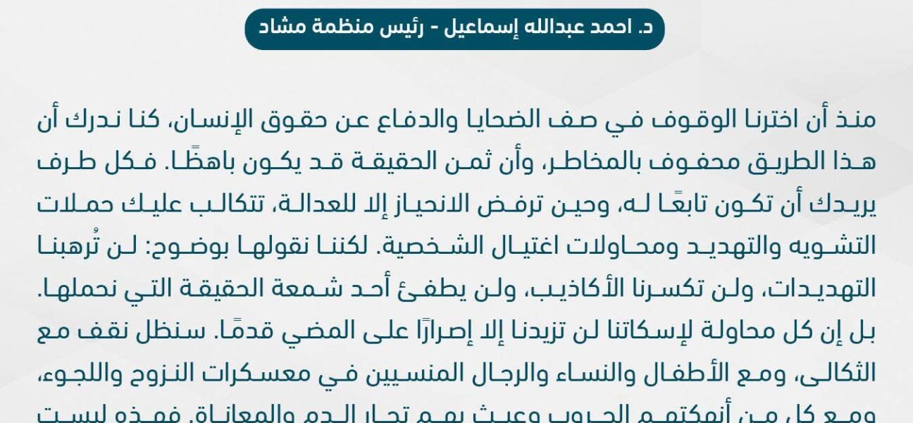 إن بناء دولة مستقرة وعادلة يتطلب قيام حكومة مدنية رشيدة تُعلي من سيادة حكم القانون وتطبقه على الجميع دون استثناء، بما يكفل تحقيق العدالة والمساواة وصون حقوق المواطنين منظمة_مشاد